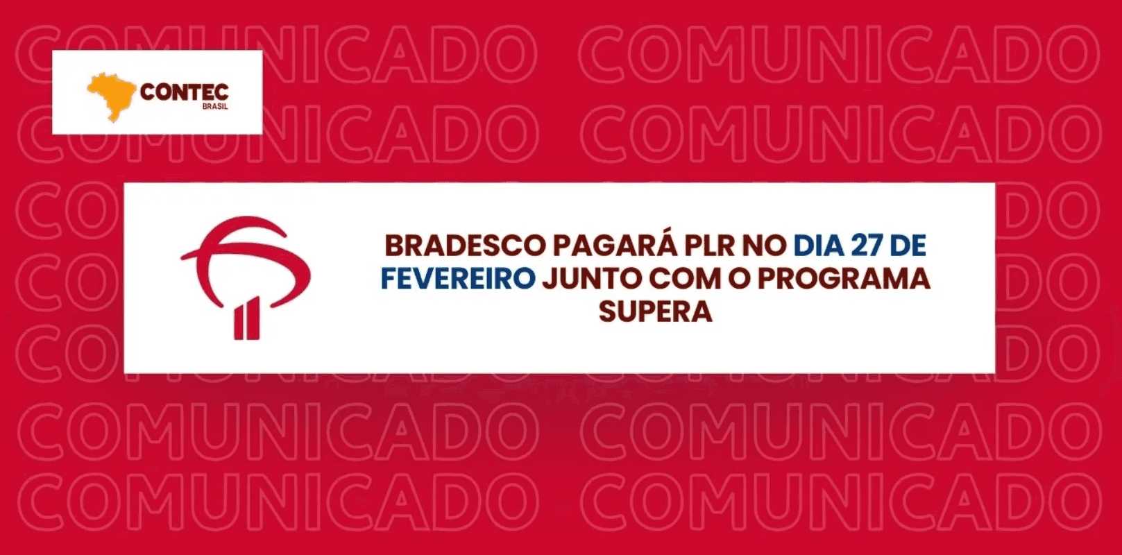 O Bradesco informou à COE (Comissão de Organização dos Empregados) do Bradesco/Contec, que realizará o pagamento da PLR (Participação nos Lucros e Resultados) no dia 27 de fevereiro. O banco também confirmou que será pago o adicional de PLR cheio, no valor de R$ 3.668,29 mais a regra básica da PLR majorada.