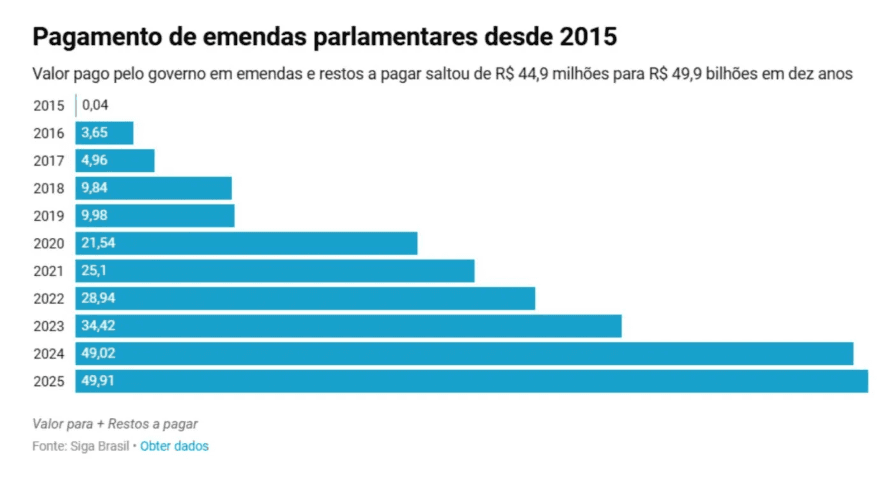 A antecipação ocorre em um contexto de expansão do volume das emendas parlamentares. Desde 2014, o montante pago pelo governo nesse tipo de repasse passou de R$ 44,9 milhões para R$ 49,9 bilhões, em 2025, um aumento de cerca de 910 vezes.
