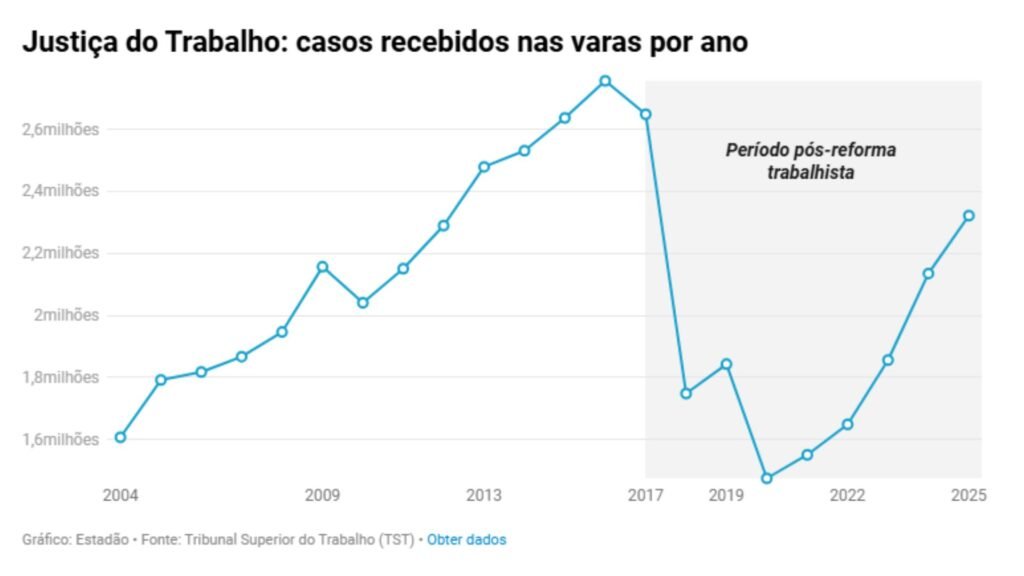 O aumento acompanha o crescimento de ações trabalhistas, que bateu mais um recorde no período pós-reforma trabalhista. Foram 2,3 milhões de novos processos nas varas do trabalho em 2025 — um aumento de 8,7% em relação ao ano anterior (2,1 milhões).