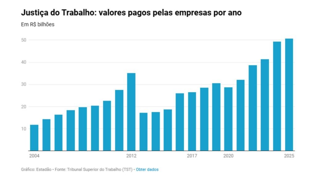 Em termos de comparação, o gasto das empresas supera o orçamento da Justiça do Trabalho em 2025, de R$ 30 bilhões . “Houve uma época em que os valores empatavam”, observa Neiva.