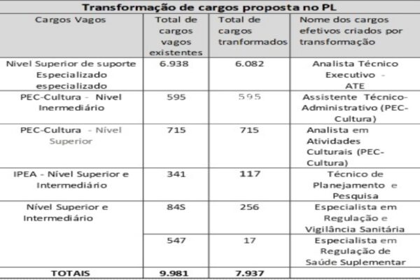 Ao mesmo tempo, o governo pretende transformar 9.981 cargos vagos em 7.937 novas funções, principalmente para compor a carreira transversal de Analista Técnico do Poder Executivo (ATE), voltada a áreas administrativas. A junção engloba profissões como administração, arquivologia, contabilidade, biblioteconomia e comunicação social.