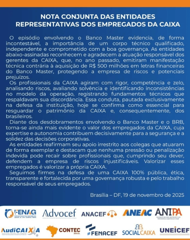 O episódio envolvendo o Banco Master evidencia, de forma incontestável, a importância de um corpo técnico qualificado, independente e comprometido com a boa governança. As entidades abaixo-assinadas reconhecem e agradecem a atuação responsável dos gerentes da CAIXA, que, no ano passado, emitiram manifestação técnica contrária à aquisição de R$ 500 milhões em letras financeiras do Banco Master, protegendo a empresa de riscos e potenciais prejuízos.