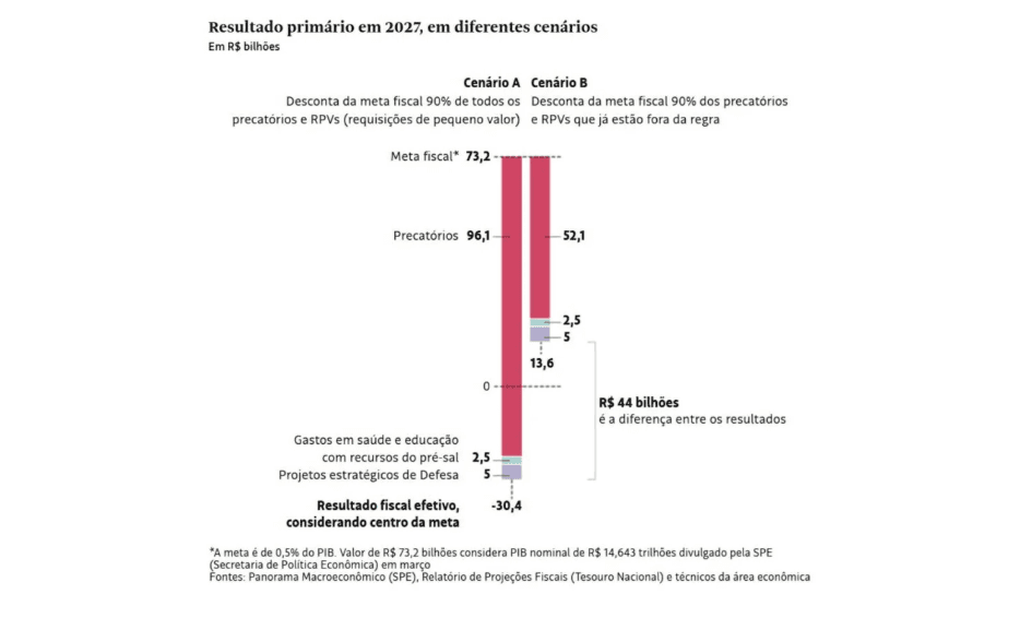 Esse cenário poderia gerar uma trajetória mais benevolente para a dívida pública ao reduzir o tamanho das despesas fora da meta. Por outro lado, obrigaria o governo a arranjar R$ 44 bilhões em receitas extras para cobrir uma parcela maior dos precatórios.