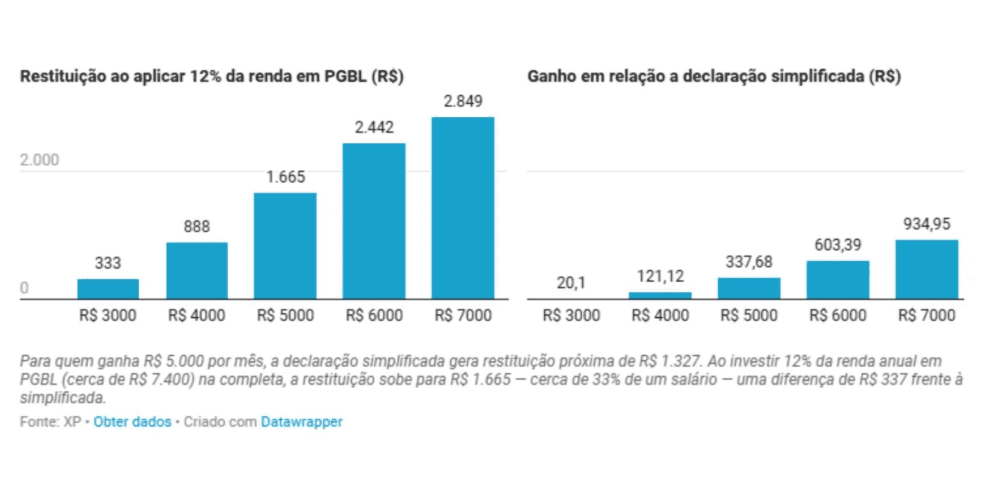 Além disso, há o benefício de estar se investindo no futuro. “É uma diferença bem pequena ali de fazer simplificada e fazer PGBL (R$ 338), mas ainda assim o investidor estará fazendo um aporte para ele no futuro”, comenta.