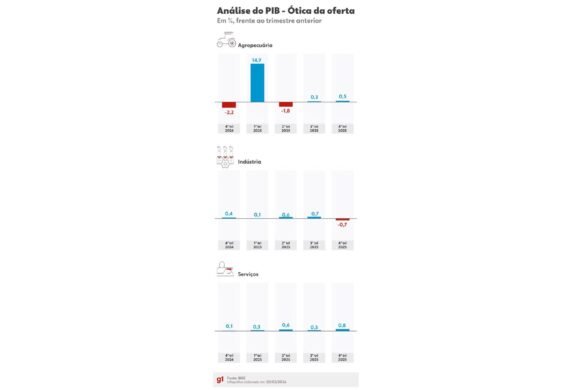 O setor de serviços, por sua vez, apresentou um avanço de 1,8% no ano e registrou um crescimento de todas as atividades em 2025 — mesmo com o alto nível de juros. Entre os destaques, estavam informação e comunicação (6,5%), atividades financeiras, de seguros e serviços relacionados (2,9%) e transporte, armazenagem e correio (2,1%).