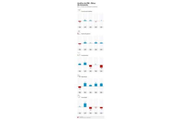 Pela ótica da despesa, o consumo do governo cresceu 1% e o consumo das famílias ficou estável. Os investimentos, por sua vez, caíram 3,5% no período.